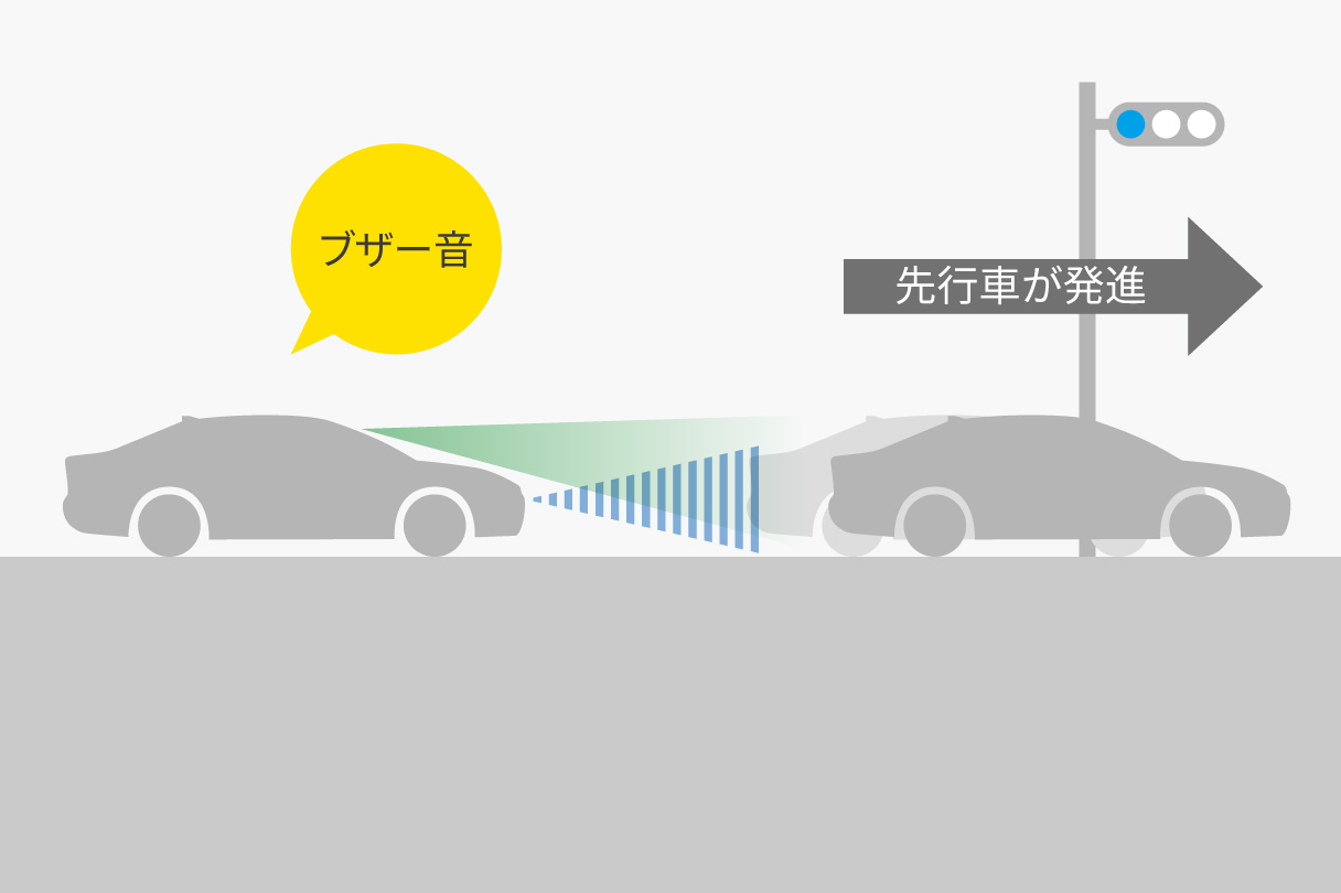 信号待ちや渋滞で先行車に続いて停止し、先行車の発進に気づかずそのままでいる場合には、ブザーとディスプレイ表示でお知らせします。