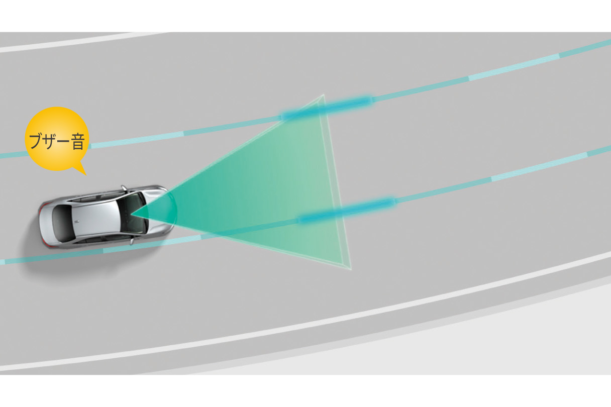 ■本システムは幅約3m以上の車線を自車速度約50km/h以上で走行時に作動します。また道路状況、車両状態および天候状態等によっては、ご使用になれない場合があります。詳しくは取扱説明書をご覧ください。 ■レーンディパーチャーアラートはあくまで運転補助機能です。本機能を過信せず、必ずドライバーが責任を持って運転してください。